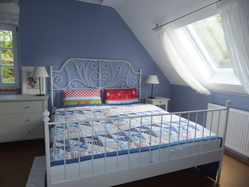 Das separate Schlafzimmer ist mit einem Doppelbett, einem Nachttisch, einer Kommode und einem Schrank ausgestattet. Bettwäsche, Bettdecken und Kissen sind für alle Schlafplätze vorhanden.